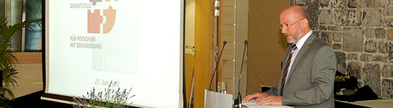 Helmut Heinen, Geschäftsführender Direktor, anlässlich des Festaktes zum 20-jährigen Bestehen der DPB am 23.6.2010 im Ministerium der DG in Eupen ![]() Sehr geehrter Herr Parlamentspräsident, sehr geehrter Herr Minister-Präsident, sehr geehrte Frau Ministerin, sehr geehrter Herr Aufsichtsminister Mollers, sehr geehrte Damen und Herren in Ihren Titeln und Funktionen, liebe Festgäste, nachdem die Verhandlungen zur Übertragung der Behindertenpolitik an die Gemeinschaften unseres Landes abgeschlossen waren, verabschiedete der Rat der Deutschsprachigen Gemeinschaft am 19. Juni 1990 einstimmig das Dekret zur Schaffung der Dienststelle für Personen mit Behinderung. Damit bündelte die DG als erste in Belgien alle Aufgaben im Behindertenbereich, die ihr vom Nationalstaat übertragen worden waren, in einer einzigen Anlaufstelle. Die anderen Gemeinschaften bzw. Regionen schlugen diesen Weg im Nachhinein ebenfalls ein. Unter der Verantwortung des damaligen Sozialministers M. GROSCH wurde im Juli 1990 ein erstes Büro der Dienststelle an der Aachener Straße 69-71 in St. Vith bezogen und fand im September 1990 in Herzebösch/Elsenborn eine erste Gemeinschaftsaktion unter dem Titel «Gemeinsam Leben» statt. Am 17. MAI 1991 setzte dann Minister K.H. LAMBERTZ den ersten Verwaltungsrat der Dienststelle ein. Damit konnte diese öffentlich-rechtliche Einrichtung mit eigener Geschäftsführung ihre Arbeit aufnehmen. Herr Lambertz war von November 1990 bis Juni 2004 Aufsichtsminister der DPB dann übernahm Herr Gentges bis Juni 2009 und seit vergangenem Jahr gewährleistet Herr Minister Mollers die Aufsicht der Dienststelle. Unser Verwaltungsrat beendet zum Abschluss dieses Jahres sein 4. Mandat. Eine Auflistung aller Tätigkeiten dieser vergangenen 20 Jahre würde sicherlich den Rahmen der heutigen Feier sprengen, kann aber in den jährlichen Tätigkeits- und Finanzberichten der Dienststelle nachgelesen werden. Genauso wie die schönen Bilder aus den Filmbeiträgen, die Sie heute sehen, nur Streifzüge sind, werde ich mich auf die wesentlichen Entwicklungen und Perspektiven begrenzen – ohne Anspruch auf Vollständigkeit. 1. Das Aufholprogramm: Es musste also eine völlig neue Verwaltung aufgebaut werden. In fliegendem Wechsel musste die Aktenbearbeitung, die Aufsicht und Bezuschussung übernommen werden. Eine erste Analyse ergab sehr schnell, dass die Anzahl der vorhandenen Aufnahmeplätze nicht den Bedürfnissen der Menschen in der DG entsprach. In Ermangelung von Angeboten, die durchaus in unserer Region machbar waren, fanden viele behinderte Menschen keine Aufnahme oder mussten im Ausland untergebracht werden. Aber